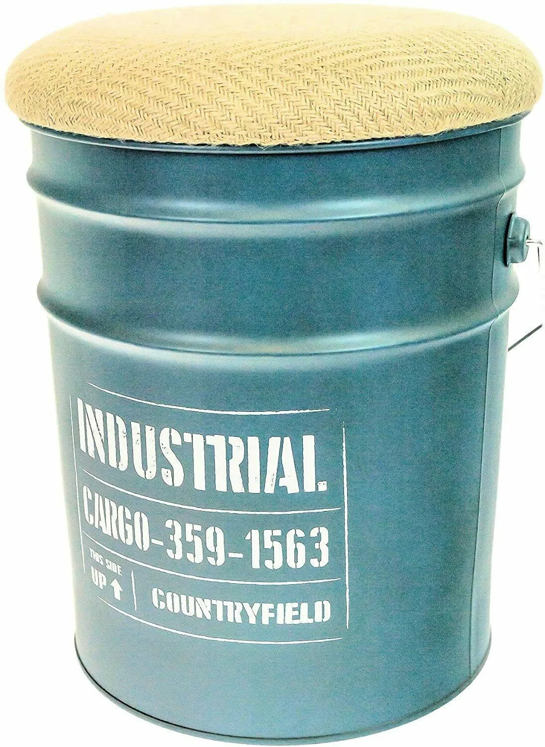 Barril de metal con asa y tapa. Perfecto para sala de estar, dormitorio, sala de juegos para guardar juguetes, ropa, trozos y bobs y proporcionar espacio extra para sentarse. Con tapa acolchada para asiento. Diseño industrial retro. Tamaño (diámetro x altura): 31 cm x 40 cm.