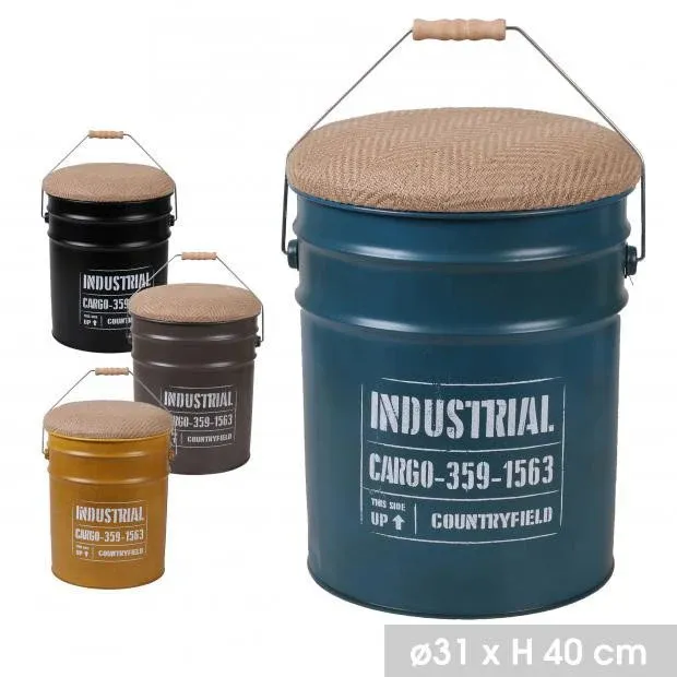 - Barril, Bidon, POUF de metal CON ASIENTO DE YUTE Y ASA DE MADERA 4 COLORES