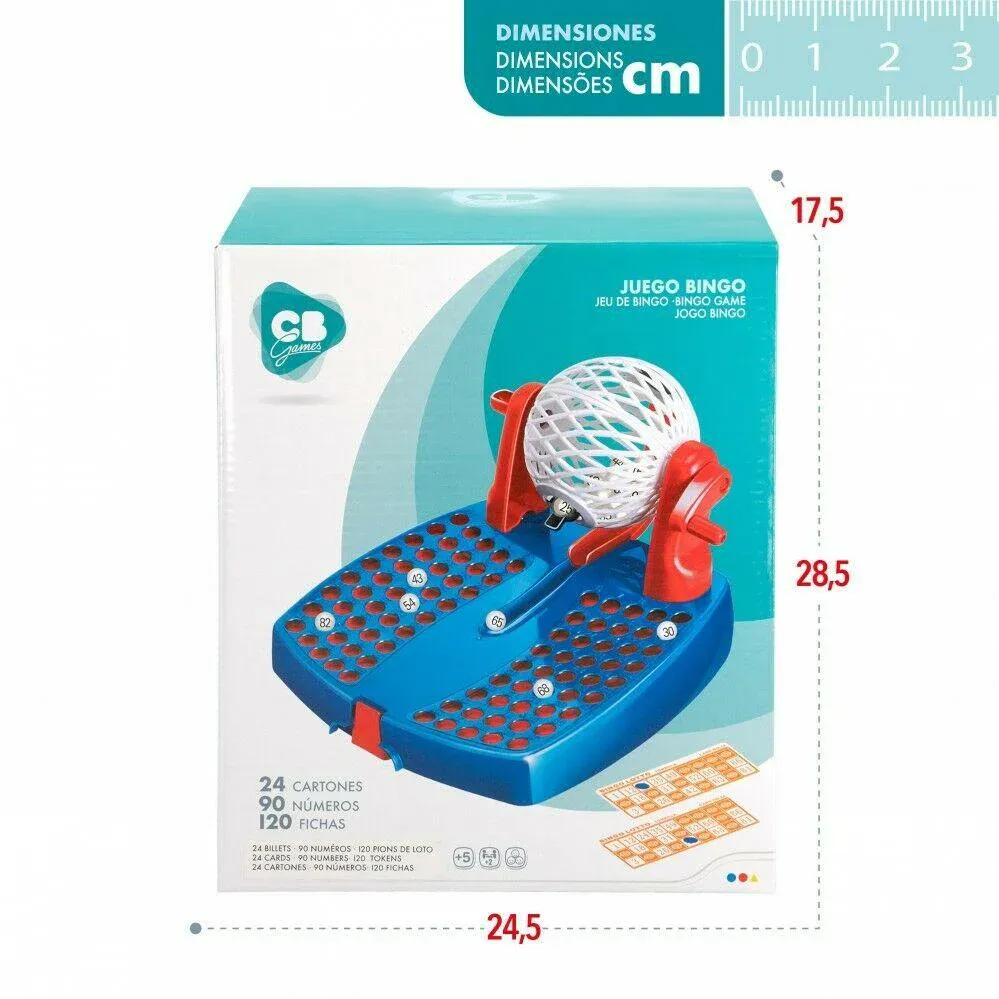 Accesorios incluidos: 120 fichas para tapar los números de los cartores, 24 cartones y 90 bolas con números del 1 al 90