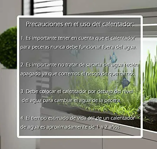 Entrega: 1 x Calentador Sumergible para Acuario o Pecera 2 x Ventosa Aviso cliente: Por favor asegure bien del tamaño de su acuario antes de comprar. Debido a la diferencia de la luz y de la pantalla, el color del artículo puede ser levemente diferente al de las imágenes. La barra de calefacción debe estar totalmente sumergida en el agua. Cuando el indicador luminoso está encendido el calentador está funcionando. Antes de limpiar la varilla de calefacción, por favor apague la tensión y deje enfriar durante 15-20 minutos. Ponga el calentador en los meses mas fríos, el agua baja de unos 24-23 Cº. El termostato del calentador ajústelo a unos 25-26 Cº. Cualquier problema, por favor póngase en contacto con nosotros.