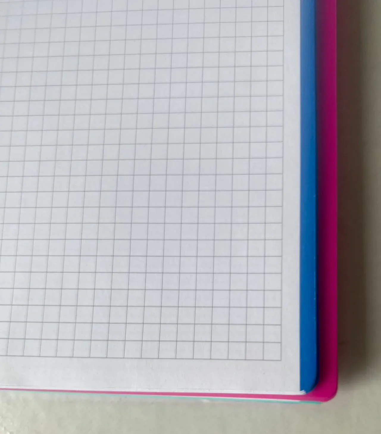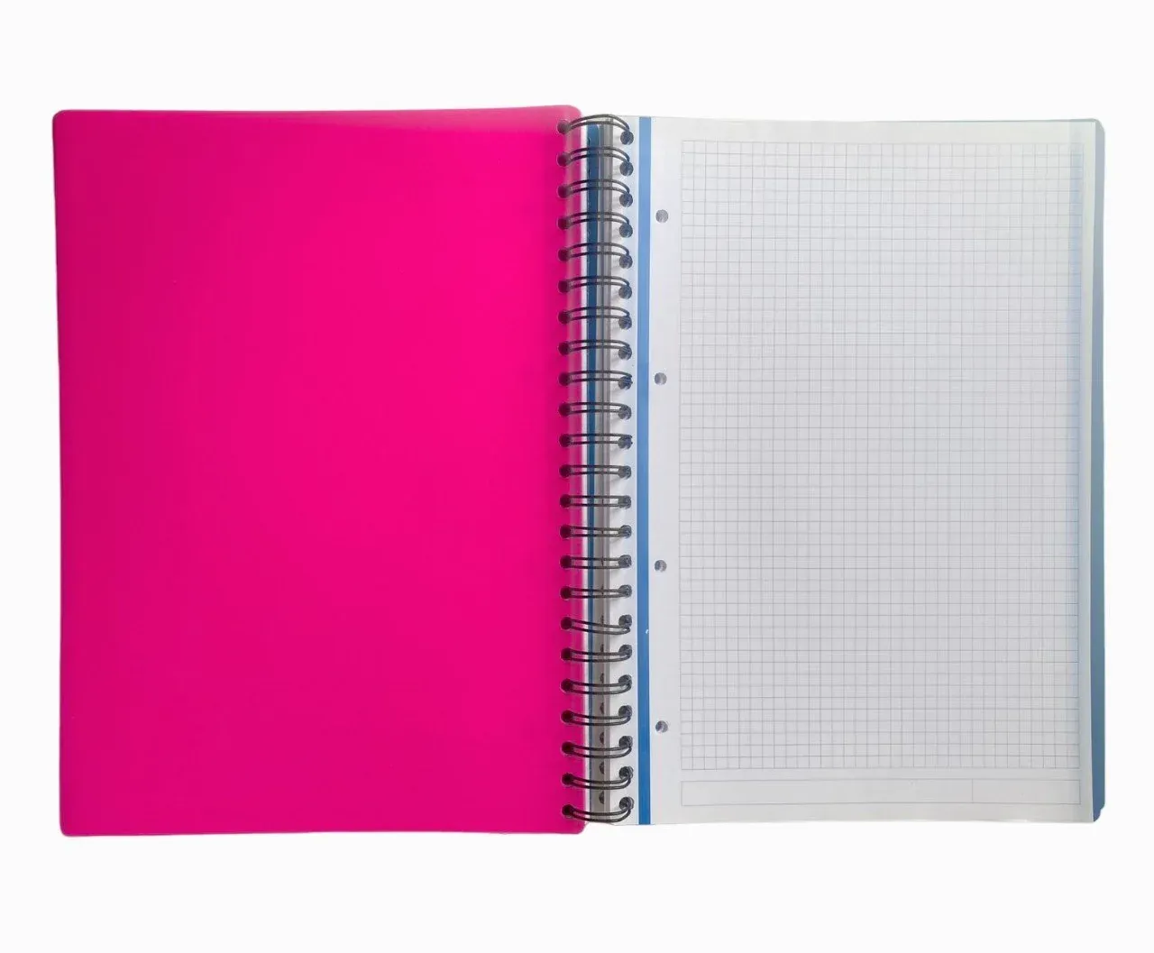 Cuaderno con 120 hojas microperfarados con 4 bandas de color, cuadrícula 5×5 mm. Tapas de Polipropileno, sobre interior y 3 separadores dobles rígidos opacos