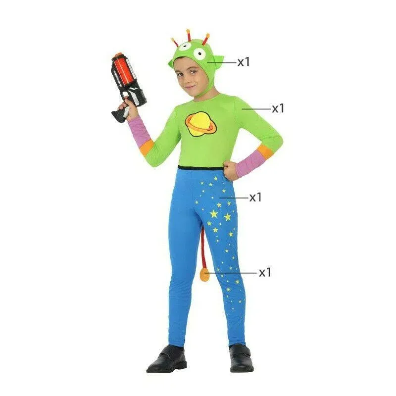 - Este disfraz tiene 4 piezas. Contenido: 1 pantalón, 1 camiseta , 1 rabito 1 gorro con antenas.