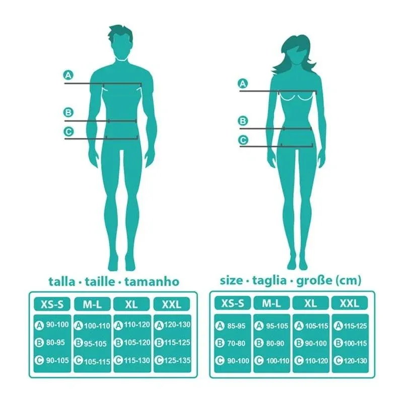 XL : contorno de pecho: 105-115 cm., de cintura: 90-100 cm., de cadera: 110-120 cm