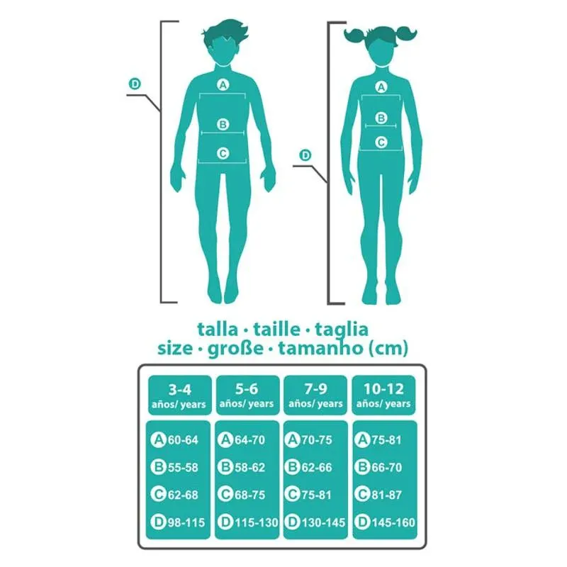3-4 Años: contorno de pecho: 55-58 cm, de cintura: 70-80 cm, de cadera: 62-68 cm, altura: 98-115 cm
