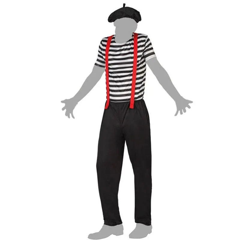 Original disfraz mimo blanco negro pensado para adultos. El género de este divertido disfraz hombre aunque no somos quién para decir quién debe o puede usarlo. Este original y barato disfraz de Carnaval de temática personajes del circo y espectáculo es un traje que te convertirá en el centro de cualquier fiesta de disfraces o evento gracias a la gran calidad de sus tejidos, sus numerosos detalles y sus ornamentaciones y filigranas.Este disfraz de fiesta se compone de 3 piezas: una boina, una camiseta con el diseño de tirantes estampado y un pantalón largo. No te conformes con ese disfraz casero ridículo que tendrás que hacer a mano y llévate un gran conjunto que le encantará a todo el mundo y los dejará sin palabras.