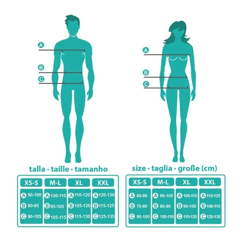 XXL: contorno de pecho: 120-130 cm., de cintura: 115-125 cm., de cadera: 125-135 cm