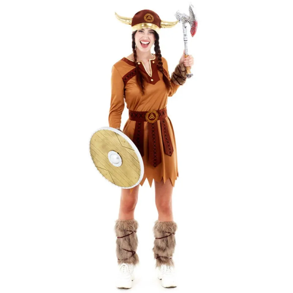 - El disfraz vikinga se compone: 1 gorro, 1 vestido y 1 cinturón, 2 muñequeras y 2 calentadores