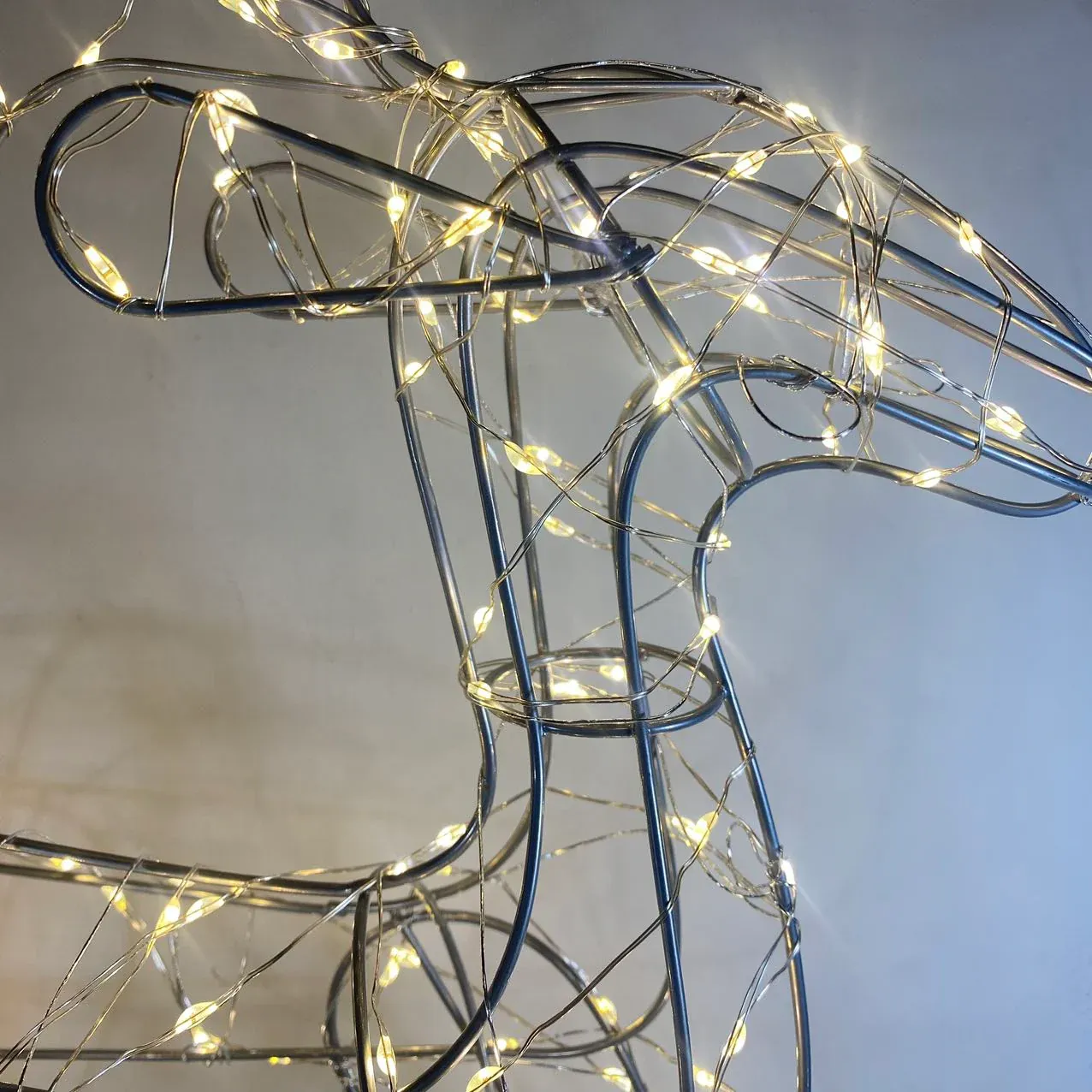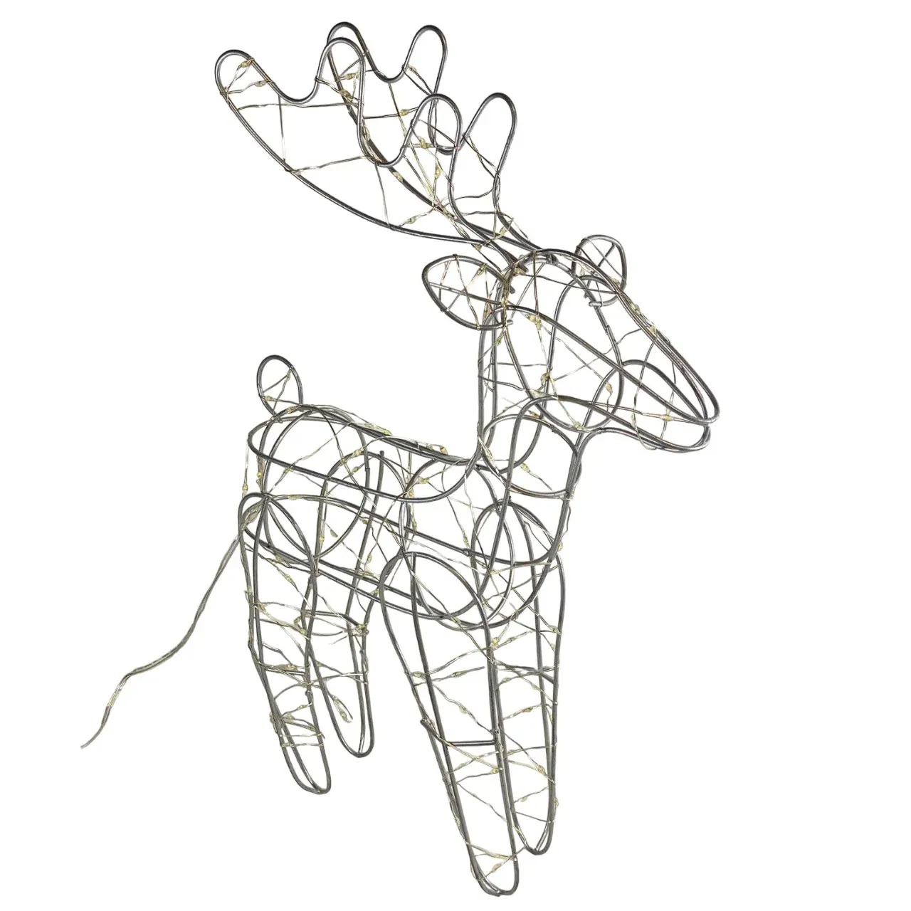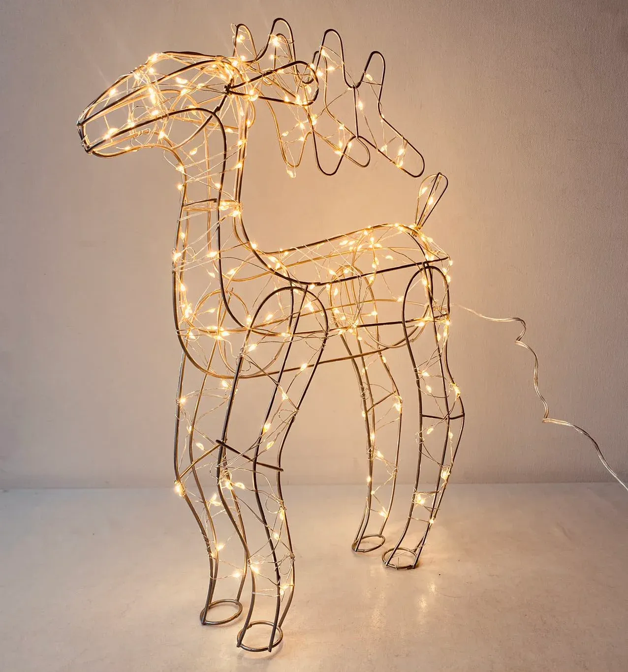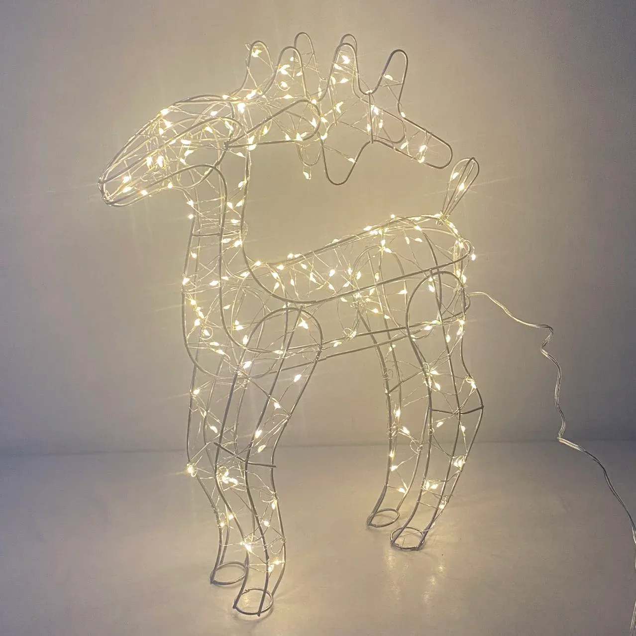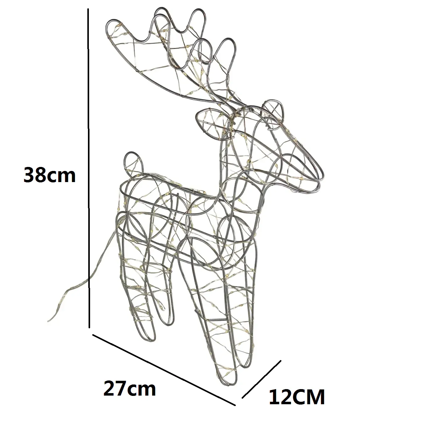La Figura Reno de Navidad de Metal es una encantadora decoración para interiores, diseñada para aportar un toque festivo a cualquier espacio. Con un acabado metálico y luces LED Blanca calida, ilumina con alegría y color, creando un ambiente cálido y acogedor. Ideal para colocar en mesas, estantes o rincones especiales, este reno se convierte en un elemento central de la decoración navideña, combinando estilo y luminosidad para celebrar la temporada.