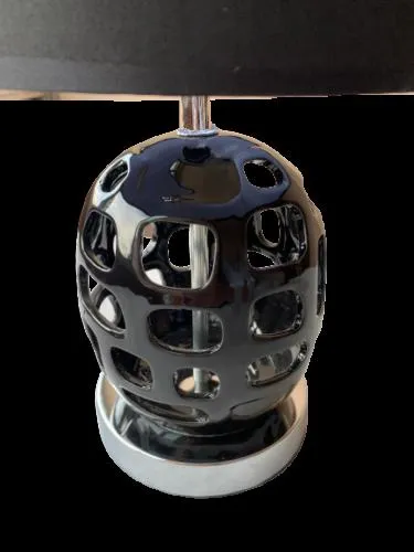 - Lámpara de mesa con base de cerámica plateada o negra y pantalla de tela negra. Aportará calidez a tu hogar y creará una atmósfera agradable.
