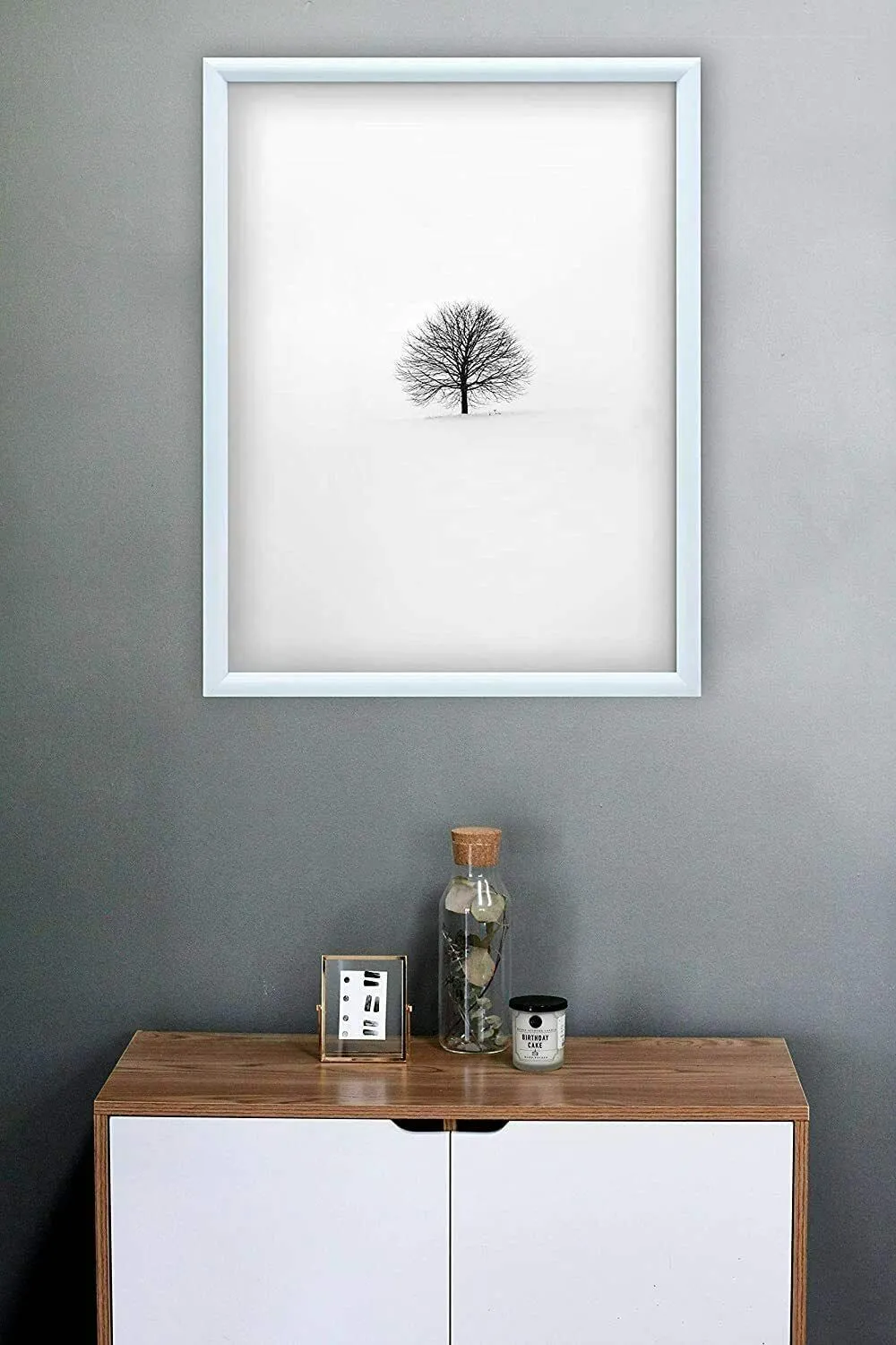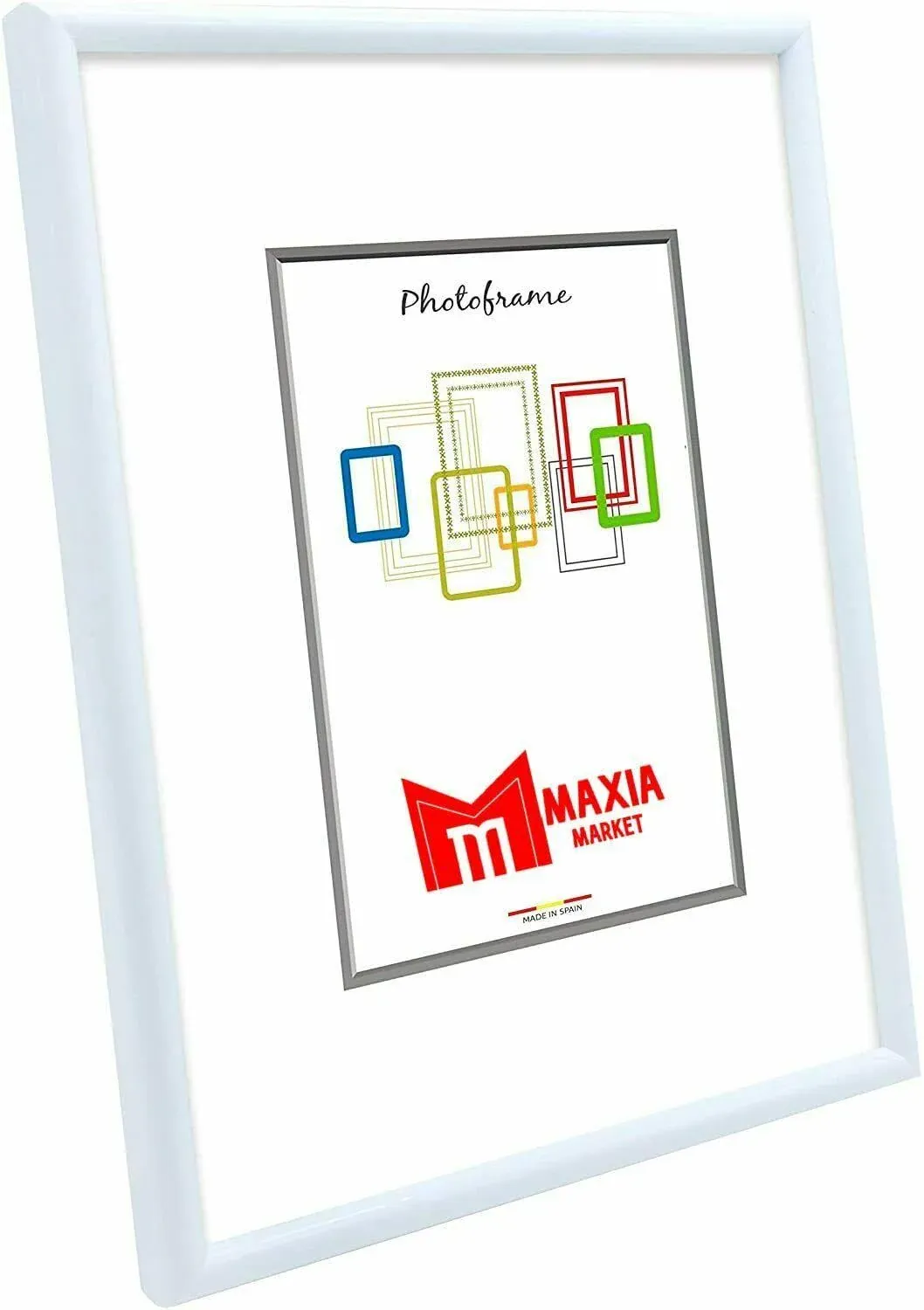 - ➮ El material de marco es de plástico con forma medio redondeado.El marco es de color Blanco frio, casi blanco. Los tamaños superiores a 20x30cm, puede haber pequeña variación de tonalidad con los tamaños inferiores de A4.