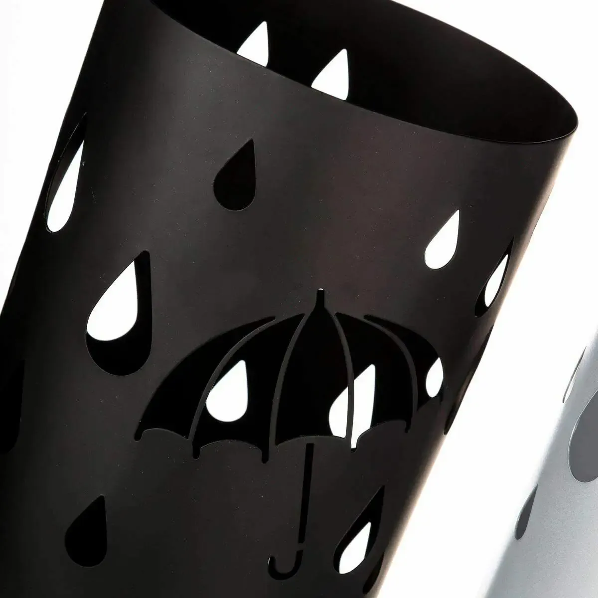 El paragüero metálico está fabricado con lámina de hierro tallada, con una innovadora técnica láser, siguiendo un patrón con calado de gotas de lluvia y paraguas.