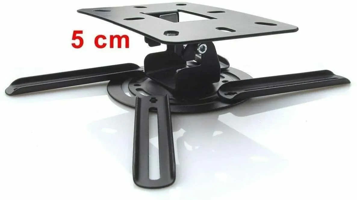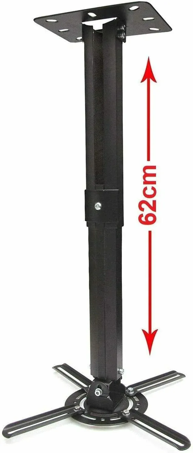 Soporte de techo y pared para proyector Giratorio e inclinable Proyector techo es universal y se adapta para todos Marca de proyectores. Ejecución: también adecuado para instalación horizontal en la pared Tipo de producto: Proyector de techo y pared. Fijación cuadrado: sin niveles con 4 puntos Max 22cm x 22 cm Extensible: de 38cm hasta 62 cm o fijo 7 y 35 cm Inclinable para: +/-90 ° | giratorio para: 360 ° | carga máxima: hasta 8 kg Peso del producto: 1,1 kg Color: negro Disponible, con Tornillos y tacos de techo para fijación.
