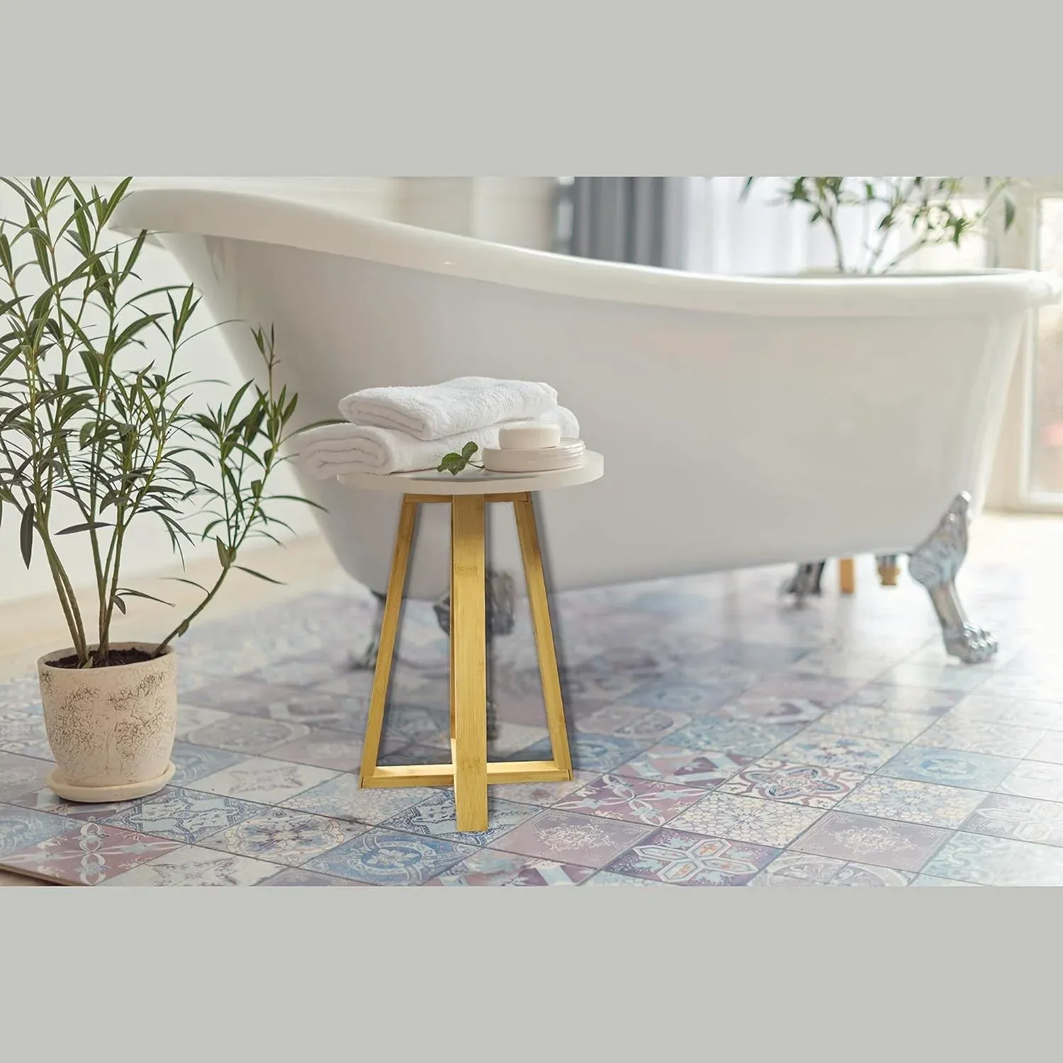 Taburete color blanco: Fabricada en bambú/MDF: las patas están fabricadas en bambú con un acabado natural, que desprende sencillez y autenticidad. La bandeja redonda blanca está hecha de madera (MDF). Tenga en cuenta que el bambú es un material natural y puede tener algunos tonos y variaciones de color.