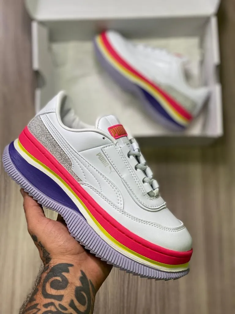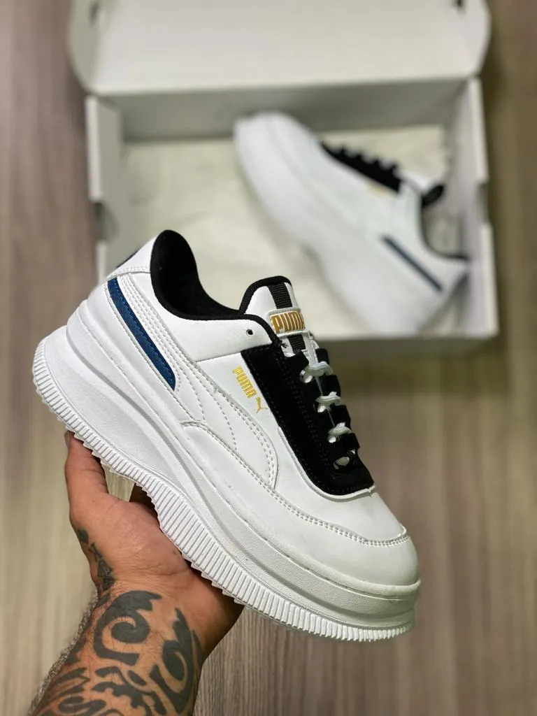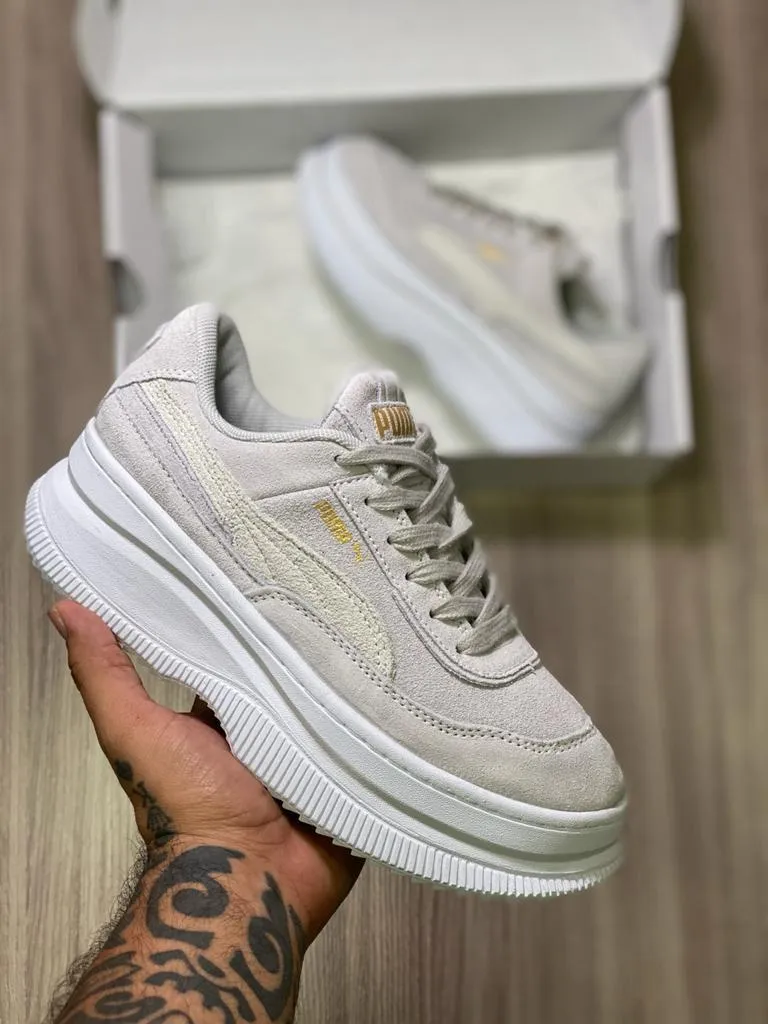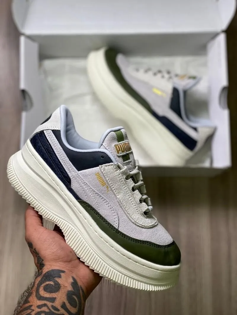 Interpretados para adaptarse a la apariencia relajada de las zapatillas deportivas de los pueblos de playa de California. La parte superior de cuero está acentuada por un empeine perforado y una raya PUMA. Lo más destacado del zapato son las nuevas herramientas de suela de copa, aunque con una suela de plataforma ligeramente elevada con un interés de textura en el área de la puntera y el talón y la marca del gato en el medio.
