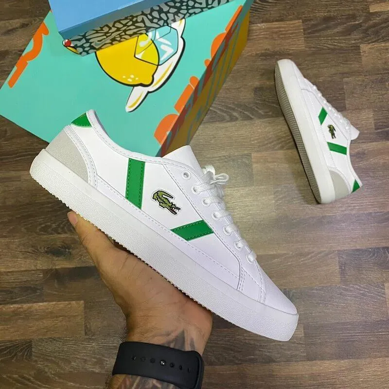 La herencia del tenis de Lacoste se celebra en el Sideline, un entrenador con cordones con una construcción vulcanizada tradicional. La parte superior está hecha de napa más suave al tacto con un acabado pigmentado. Las superposiciones con apariencia de cuero y un toque de gamuza en el talón ofrecen un atractivo de textura mientras que las costuras expuestas realzan el diseño. En un acabado característico, el cocodrilo verde se encuentra bordado en el cuarto flanqueado por líneas de color en contraste inspiradas en la cancha.