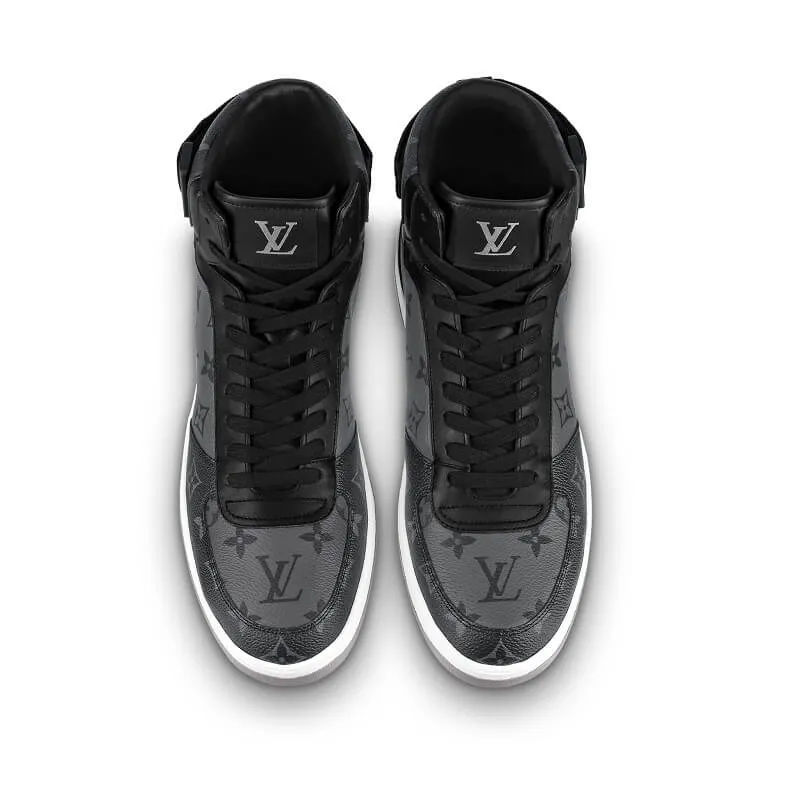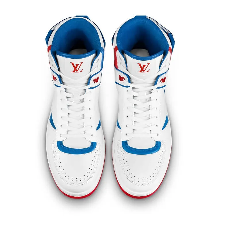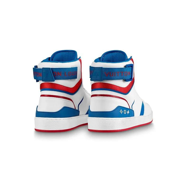 Esta zapatilla deportiva alta Rivoli está confeccionada en flexible piel de becerro de color blanco, que se combina con pinceladas de azul y rojo. Este emblemático modelo destaca por la tira de velcro, que puede llevarse en la parte delantera o trasera. La pieza luce el logotipo LV Initials en la lengüeta y tres Monogram Flowers en el lateral.