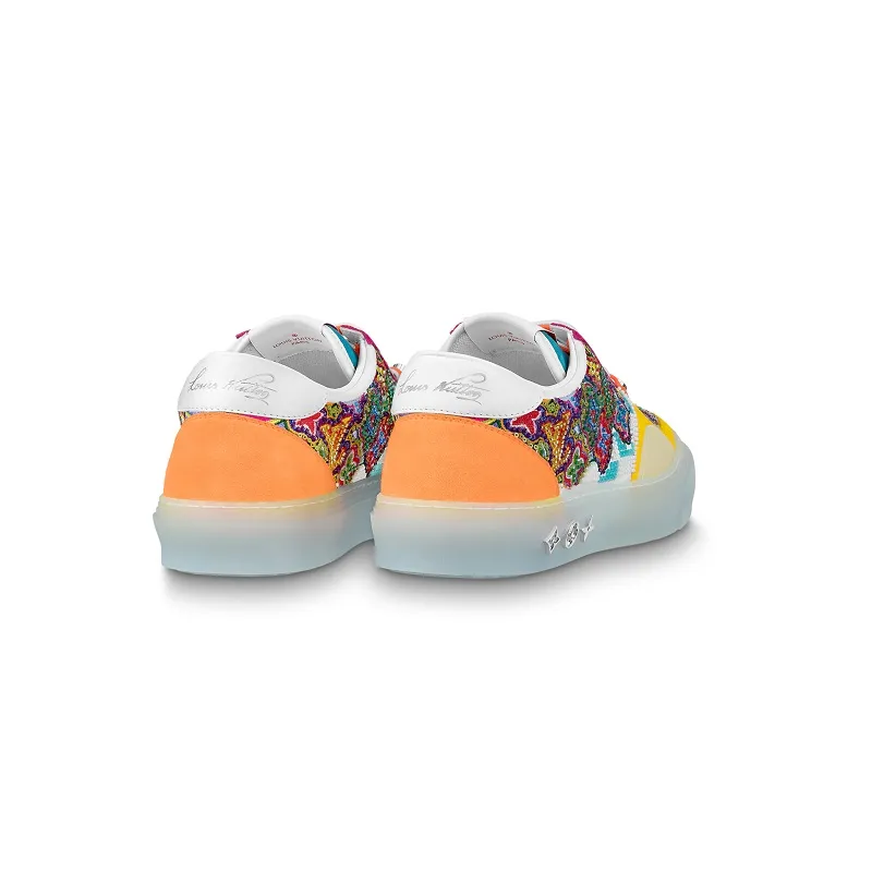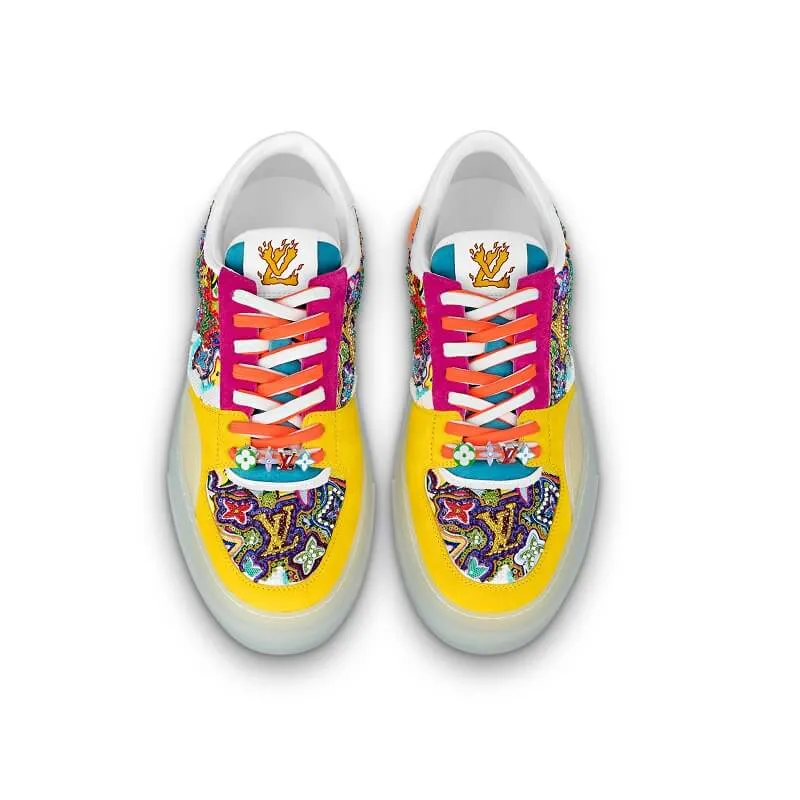 La zapatilla deportiva LV Ollie se ha adornado con un intrincado bordado de cuentas que reinterpreta el histórico motivo Damier de Louis Vuitton. La suela de goma transparente está decorada con Monogram Flowers plateadas.