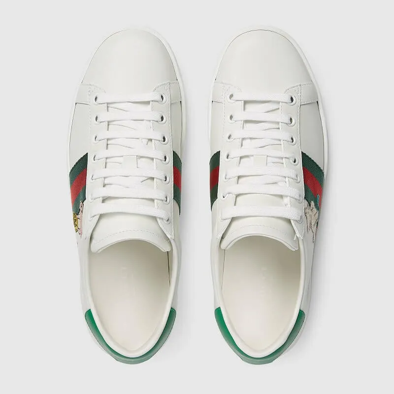 Un gatito juguetón decora la icónica zapatilla Ace de la Casa. Confeccionado en cuero blanco con una silueta estilizada, el zapato se realza aún más con la Web, un homenaje a la herencia ecuestre de la marca.